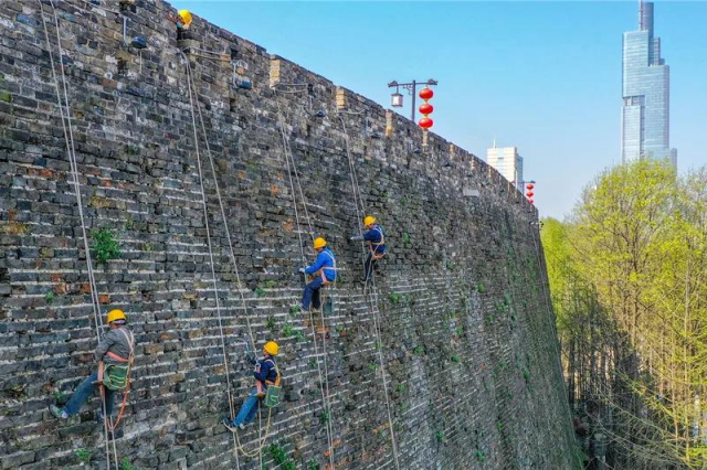 春风吹拂,草木萌发,南京城墙的“美容季”又到了。“蜘蛛人”们垂吊在高大巍峨的城墙上,清理杂树、杂草,填充缝隙。自2009年起,清除城墙本体上的杂树杂草就已成为城墙日常管养的常态化工作。