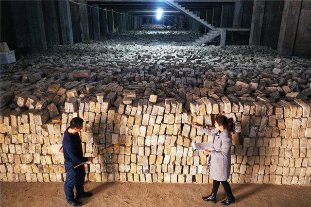 城砖仓库里整齐地码放36万余块城砖。每一次回收的城砖,工作人员都会认真清点,做好入库登记工作。