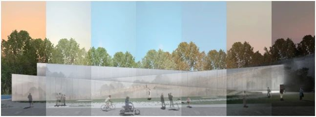 博物馆形体设计,从对街相望的中华门“搬”来了斜坡马道和平台,两大元素转化为博物馆西侧三段反向攀升、长四五十米的坡道,连接起高低错动的观景平台,形成近城低、远城高的自然态势,城墙博物馆如同古城墙脚下一个半透明的城市客厅。博物馆的互动空间不仅局限于展厅内,在博物馆外,西侧绿地自由散布有城墙相关诗文、登顶坡道沿线分布有城墙重要数字信息铜版、顶面观景平台设有京城城墙轮廓,都丰富了博物馆馆外的信息,激发游客探索城墙的兴趣,打造可参与的博物馆。