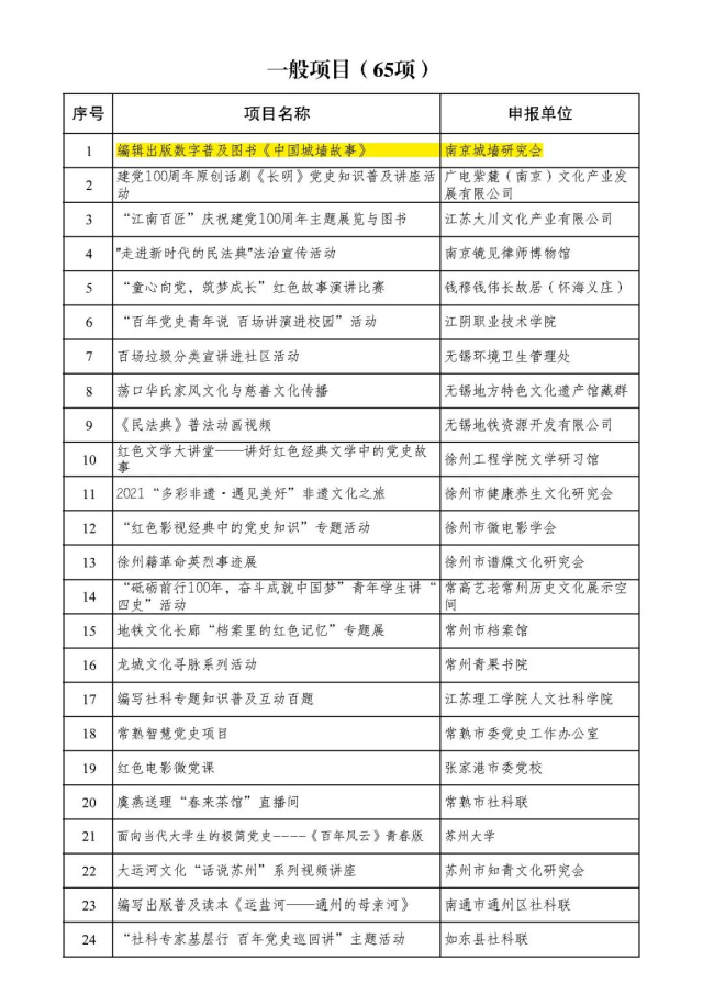 在历年的“全省文博优秀论文评选”“市文旅局系统优秀调研报告评选”等活动中获得多项荣誉,由南京城墙研究会主持申报的数字普及图书《中国城墙故事》更是入选2021年江苏省社科联社科普及项目一般资助项目,成为南京此次成功入选一般项目的4家单位中唯一一家社会团体。