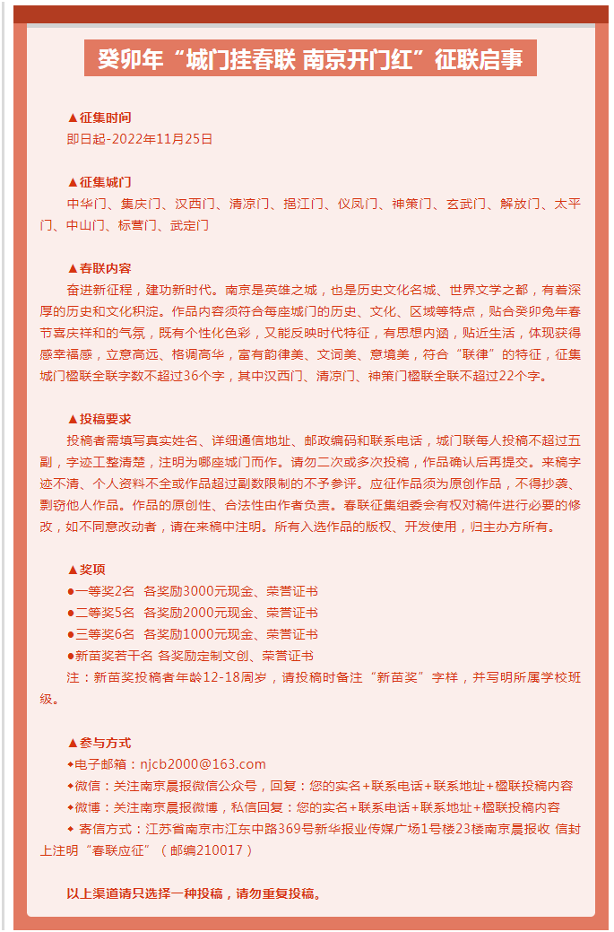 城门挂春联 | 南京13座城门向全球征集2023癸卯年春联,首次向青少年增设“新苗奖”!