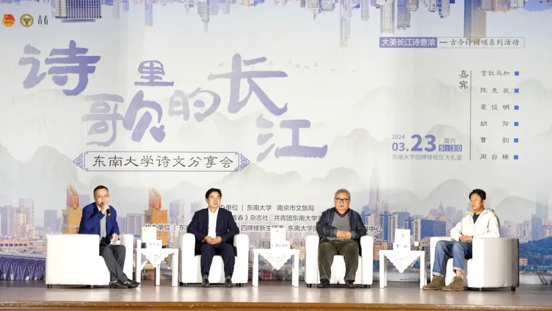 采风活动后,诗人们来到东南大学四牌楼校区,和数百名青年学子一起座谈分享“诗歌里的长江”,诗人们眼里的长江、南京的诗意之美深深感染着莘莘学子。