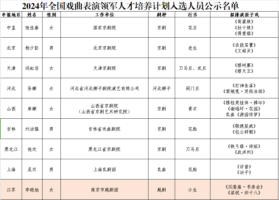 近日,文化和旅游部公示2024年全国戏曲表演领军人才培养计划入选人员名单,全国共有20位演员入选。第30届中国戏剧梅花奖得主、国家一级演员、南京市越剧团李晓旭名列其中,是本次培养计划江苏省唯一入选培养人才,也是越剧届唯一入选人才。