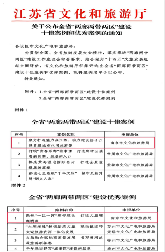 1月26日,江苏省文化和旅游厅公布了全省“两廊两带两区”建设十佳案例及优秀案例,市文旅局编写和推荐报送的《聚力打造魅力滨江游,助力建设扬子江世界级城市休闲旅游带》成功入选“十佳案例”;《聚焦“一江一河”廊带建设打造文旅璀璨明珠》成功入选“优秀案例”。