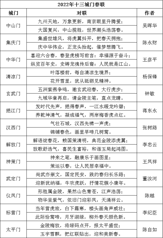 由南京师范大学教授博导、中国韵文学会会长、江苏省楹联研究会顾问钟振振,江苏省楹联研究会会长周游,解放军红叶诗社副社长、《红叶》诗刊主编徐红,江苏省楹联研究会驻会名誉副会长、南京楹联家协会主席袁裕陵,江苏省楹联研究会副会长魏艳鸣组成的专家组进行了评审,最终选出了十三城门春联。