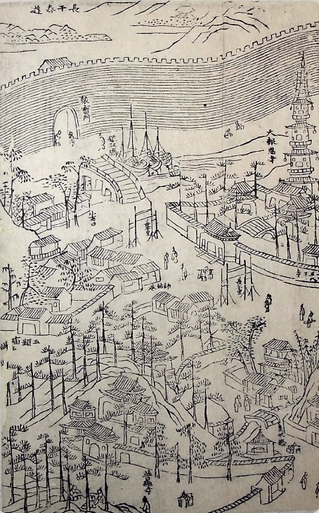 图中展示了城南聚宝门外的繁华景象,城墙外,是大报恩寺与长干里。