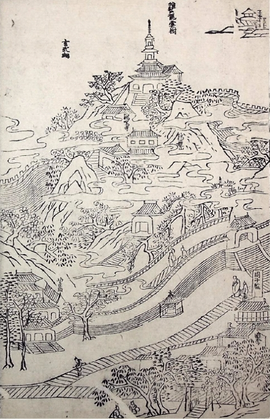 画面主体为鸡鸣寺,山下可见国子监和功臣庙,城墙在山后隐现。